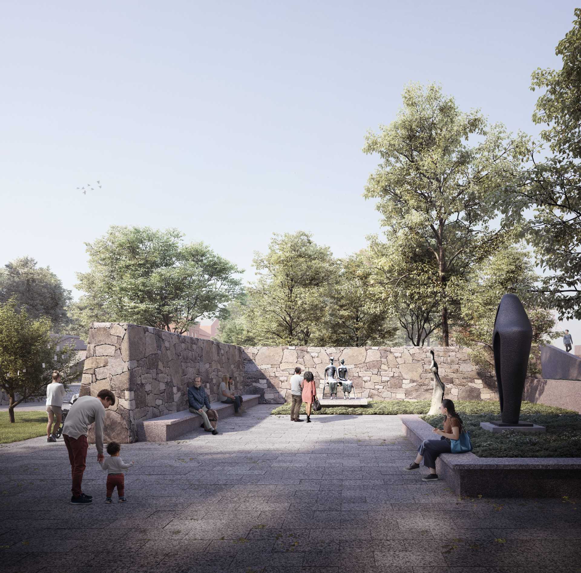 A detail from Hiroshi Sugimoto's rendering of the design for the Hirshhorn's Sculpture Garden on the National Mall features a detail of the east gallery display of Henry Moore's King and Queen and Barbara Hepworth's Figure for Landscape Credit: Hirshhorn Museum and Sculpture Garden